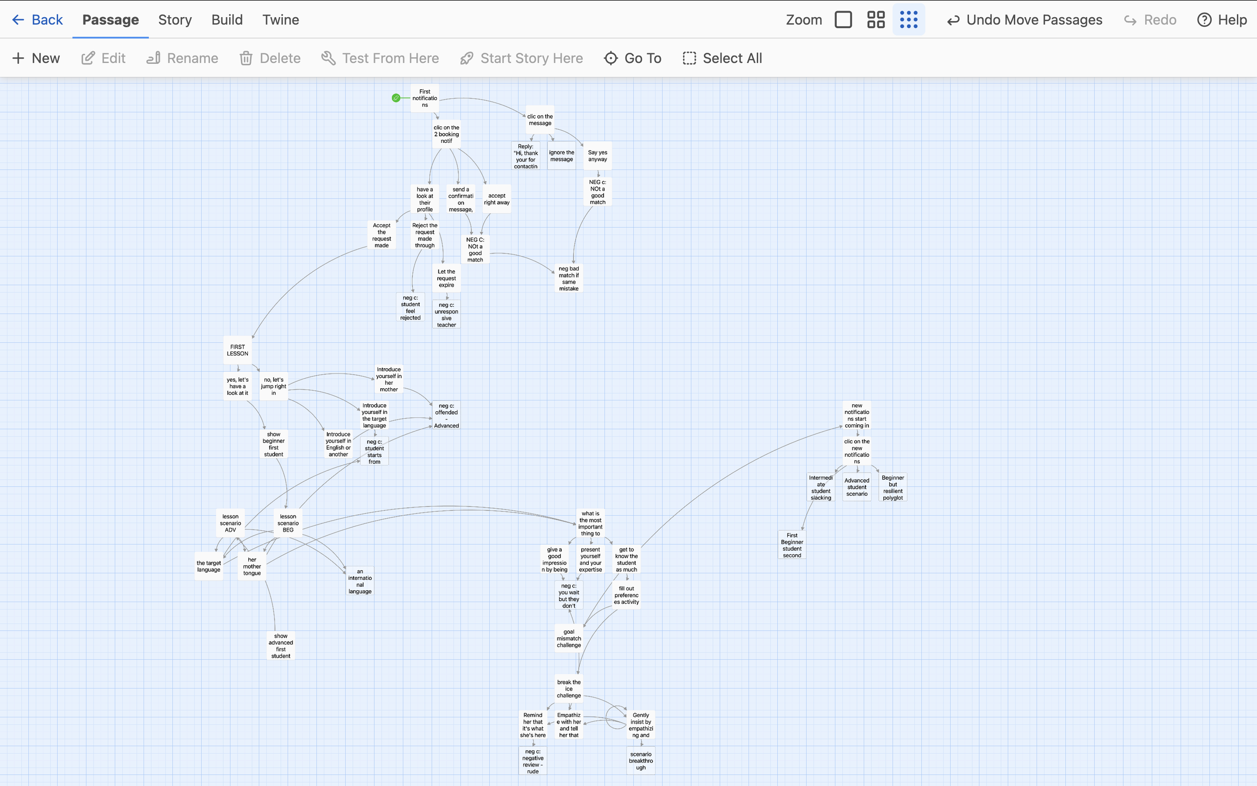 While working on the Text-Based Storyboard, I also used Twine to visualise the scenarios and their branching consequences in a very early draft form.